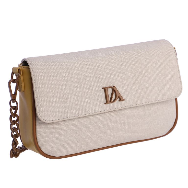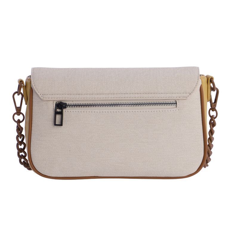 Bandolera de diseño estructurado confeccionada en tejido efecto lona en tono beige, combinada con laterales en color mostaza y ribetes en imitación cuero que aportan contraste y personalidad.