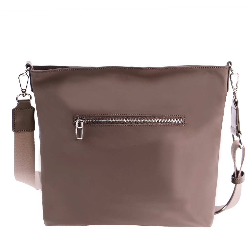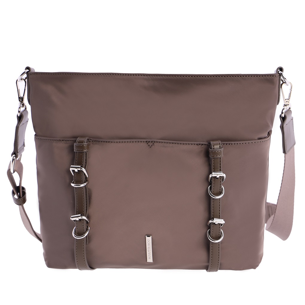 Bolso bandolera para mujer Don Algodón Tundra, confeccionado en piel sintética con logo frontal. Incluye bandolera de cinta de algodón ajustable y extraíble y cierre de cremallera con tirador metálico.