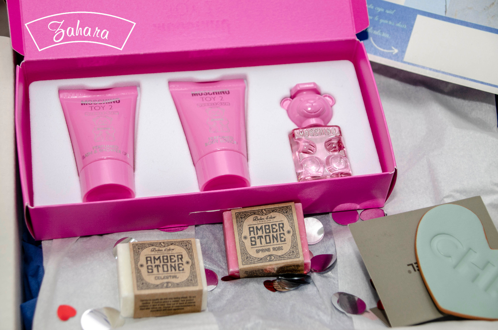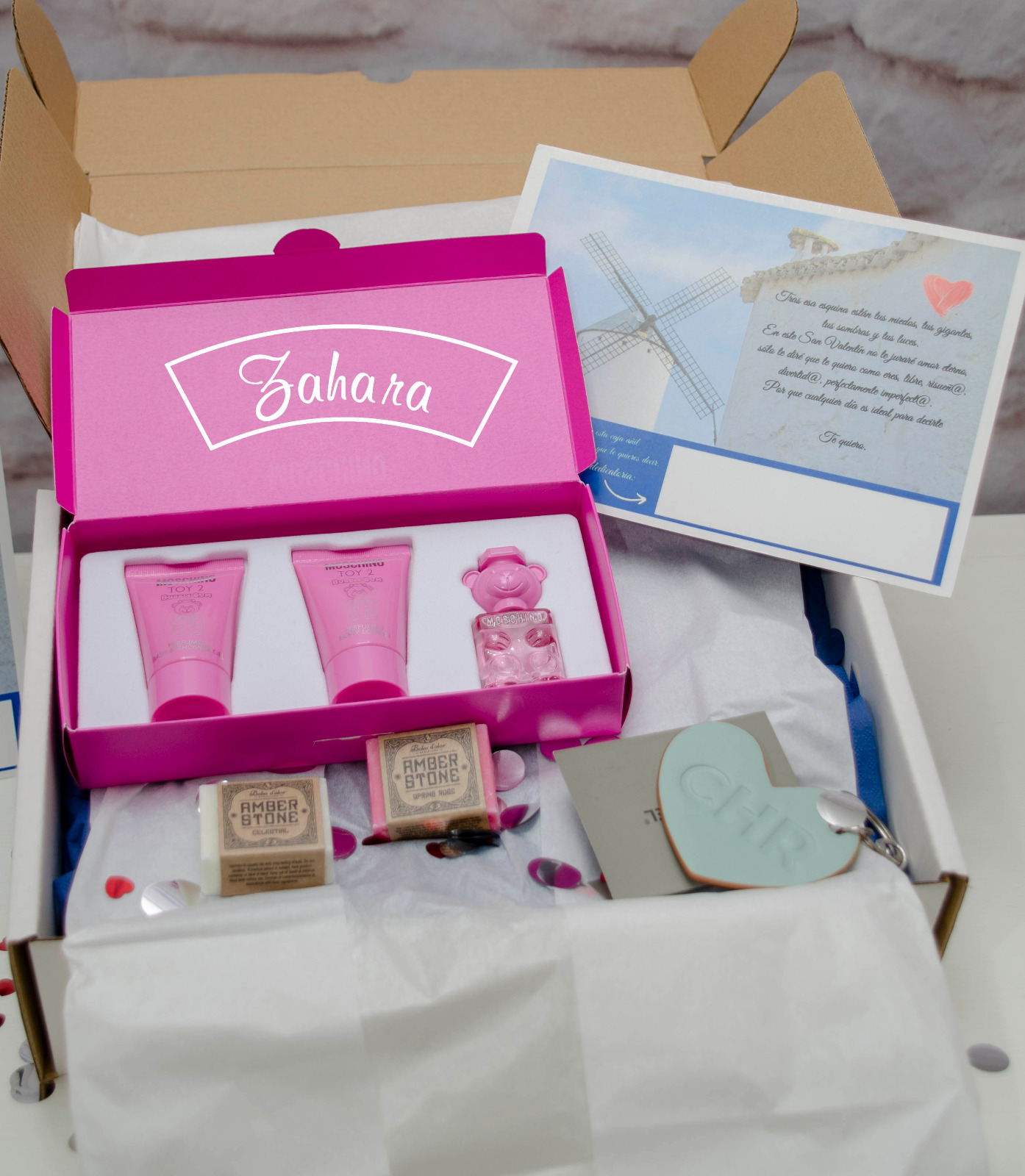 La Caja Regalo de Zahara Criptana para San Valentín pensado en ÉLLA, es el detalle ideal para sorprender a quienes disfrutan cuidándose y realzando su belleza. Esta elegante caja regalo incluye un estuche con un envase de Gel/Champú, un envase de Loción Corporal y un envase de perfume de la fragancia TOY BOY 2 de Moschino, además incorpora un llavero de cuero de la firma Cacharel y dos piezas perfumadas con distintos usos de Boles d’olor