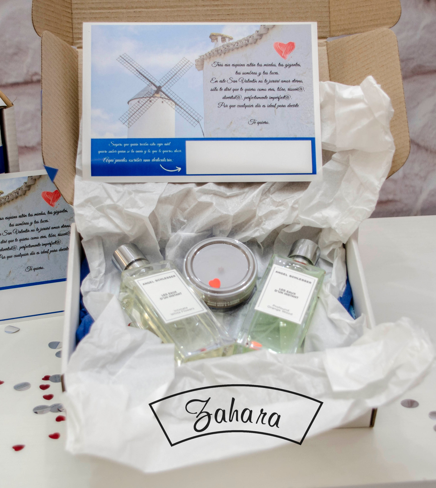 La Caja Regalo de Zahara Criptana para San Valentín pensado en AMBOS, es el detalle ideal para sorprender a quienes disfrutan cuidándose y realzando su belleza. Esta elegante caja regalo incluye 2 envases de 50ml de dos de las fragancias más exitosas de Ángel Schlesser y una vela perfumada de viaje de la marca Woodwick.