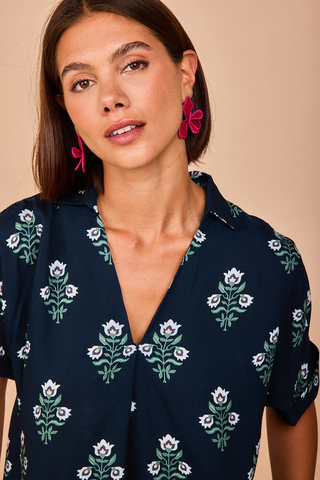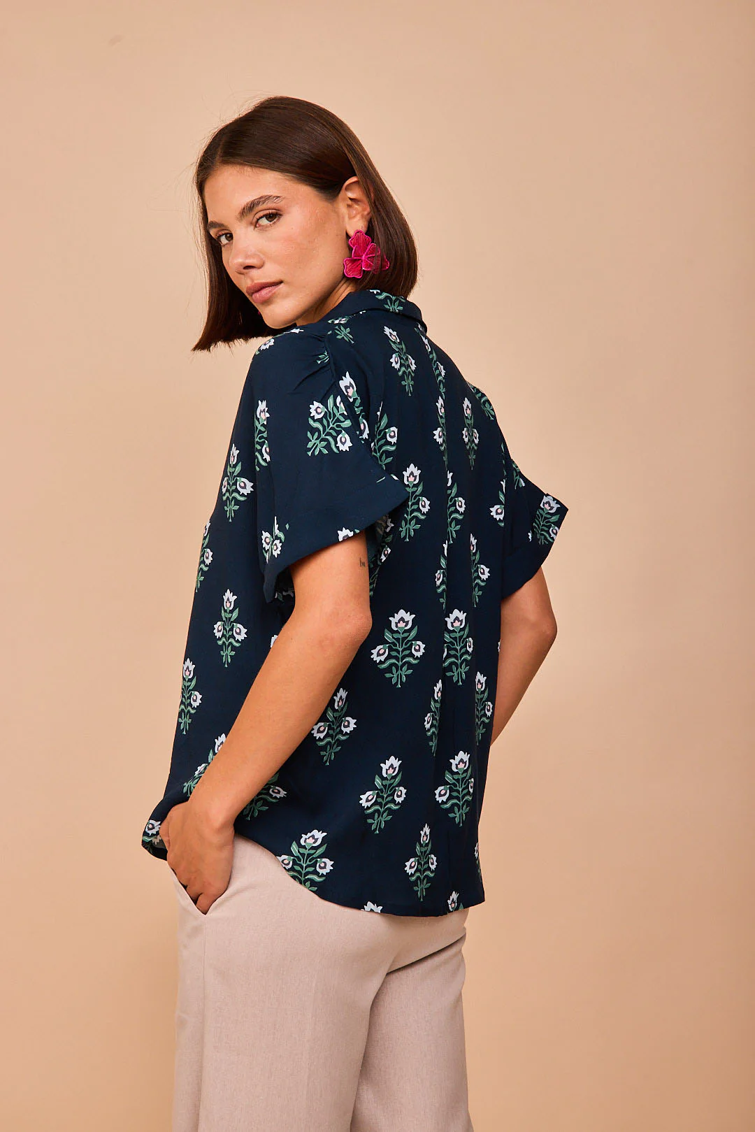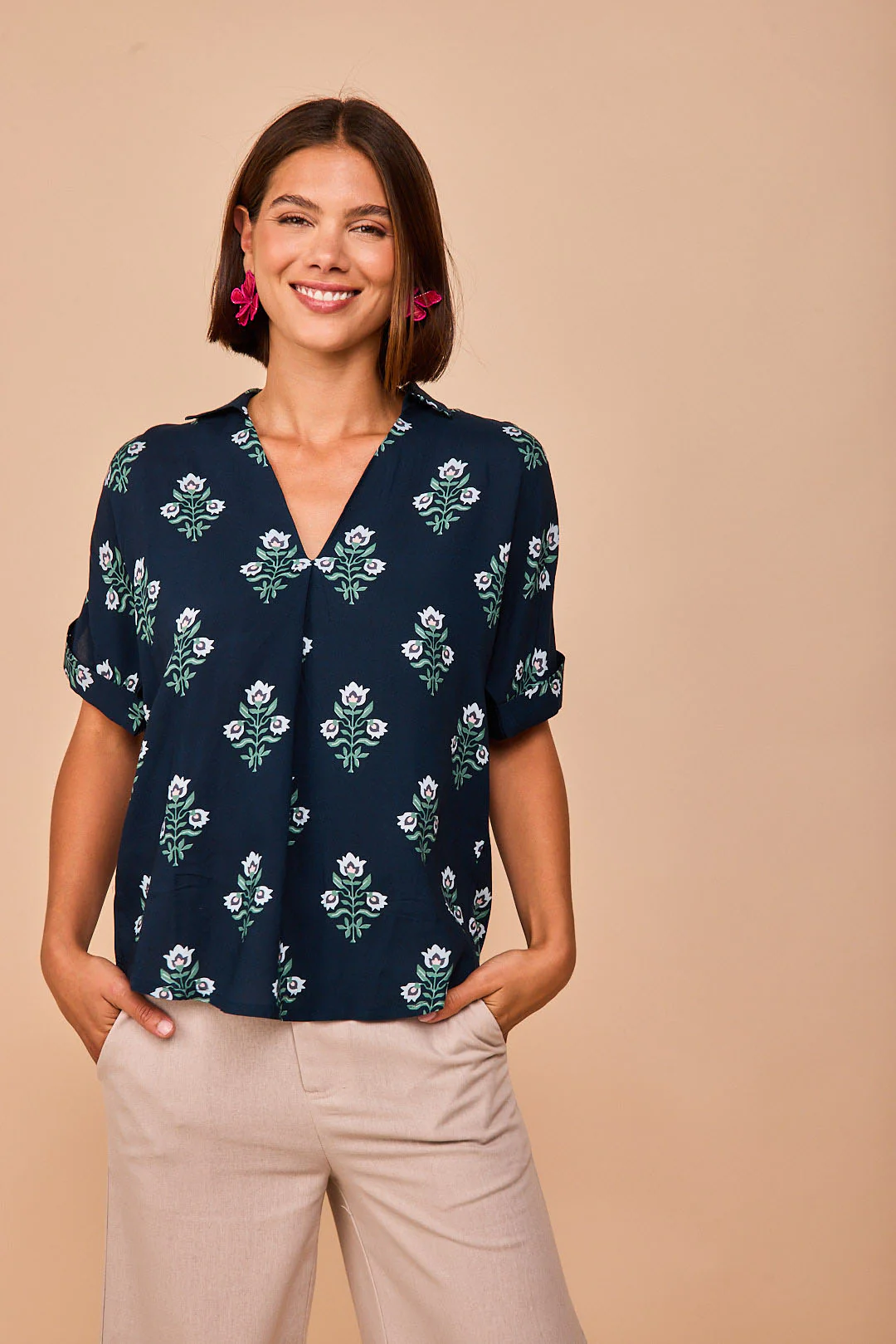Esta camisa de viscosa para mujer con escote en pico destaca por su diseño elegante y por la suavidad de su tejido. Es una de las prendas más especiales de la colección gracias a su combinación de cuello, escote en pico y manga corta con caída suave, que aporta un estilo muy favorecedor.