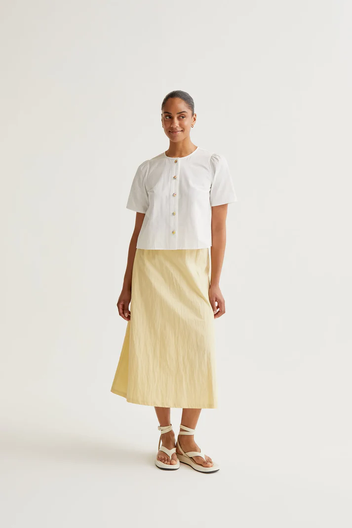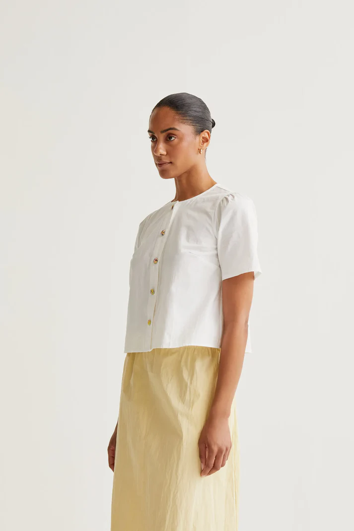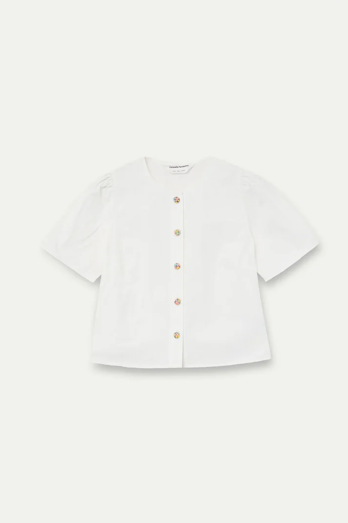 El top blanco de algodón destaca por su diseño limpio con un detalle diferencial lleno de personalidad. Su cuello redondo aporta equilibrio, mientras que la manga corta ligeramente abullonada añade un toque sutil de volumen.