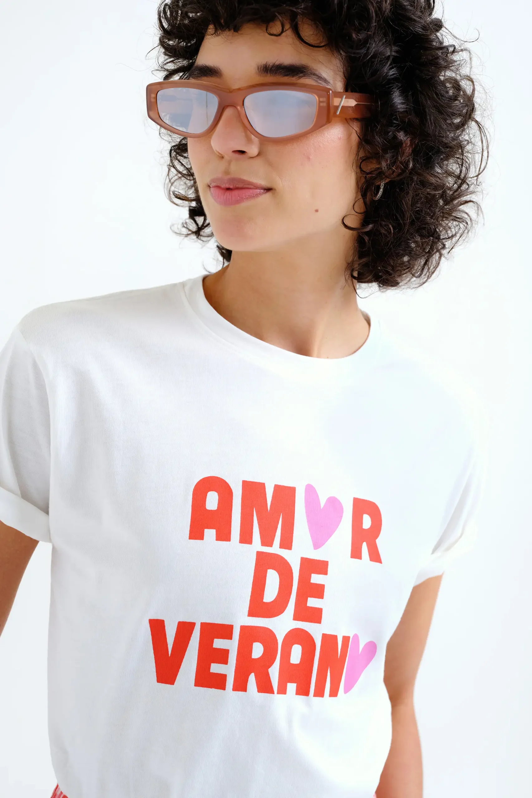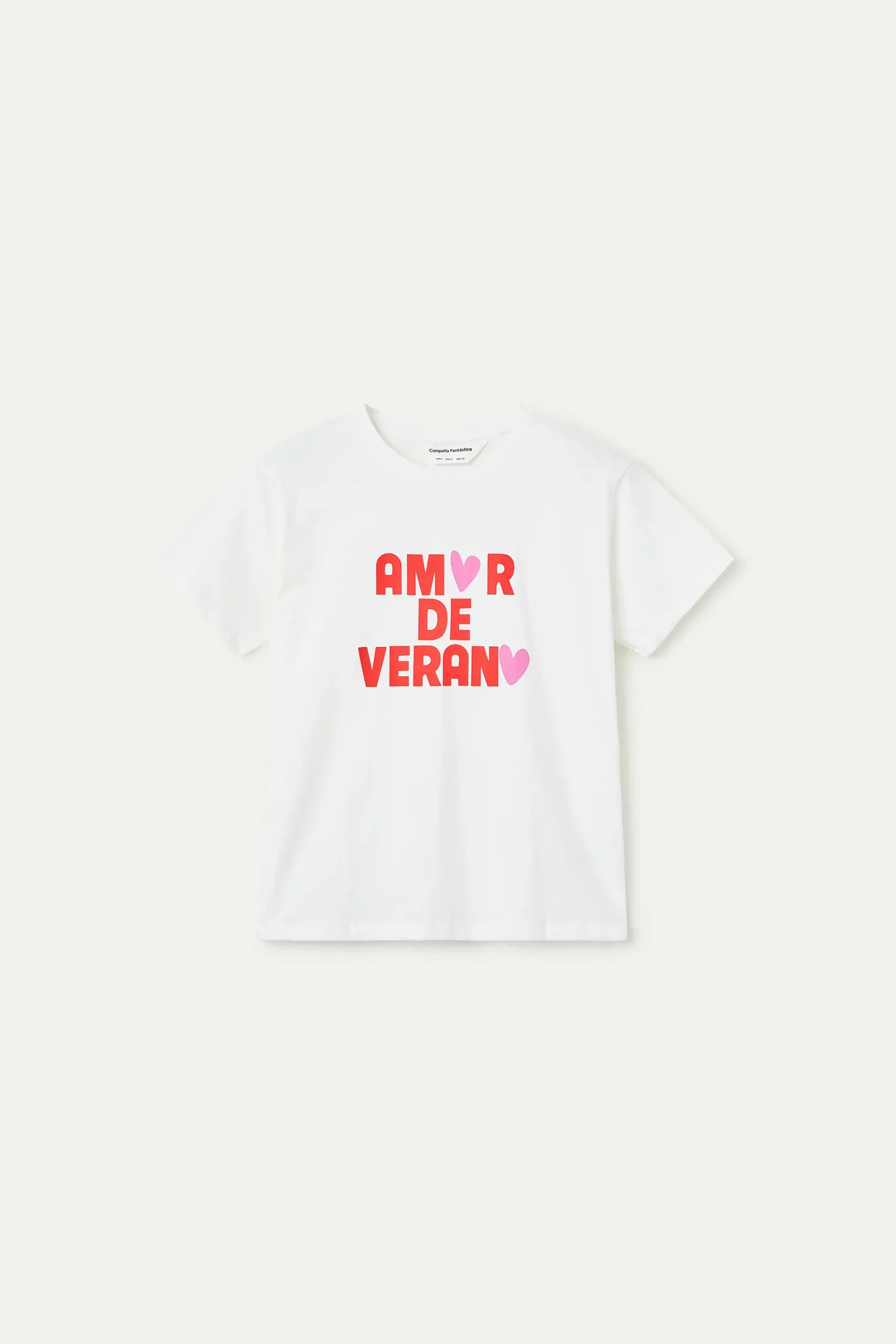 Su cuello redondo y las mangas cortas garantizan comodidad, mientras que el tejido ligero la convierte en una opción ideal para los días más cálidos. El estampado frontal con mensaje añade personalidad y un estilo desenfadado perfecto para el verano.