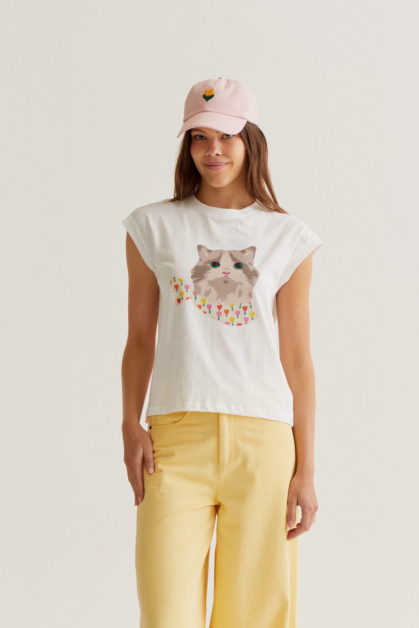 Esta camiseta de manga corta con ilustración de gato destaca por su diseño original y lleno de encanto. El dibujo central muestra un gato de expresión dulce con ojos verdes, acompañado de un detalle de pequeños corazones de colores que aportan un toque alegre a la prenda.