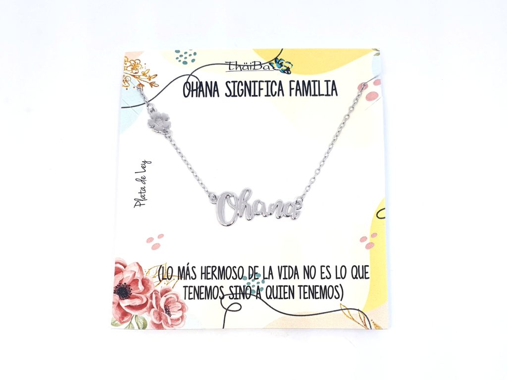 Collar con la palabra «Ohana», que simboliza familia, elaborado en plata de ley y con cadena ajustable a tres longitudes.