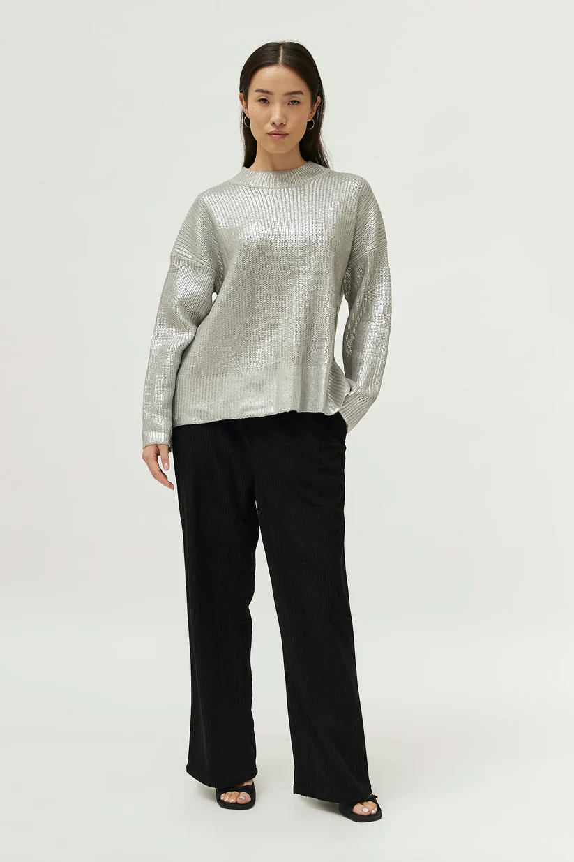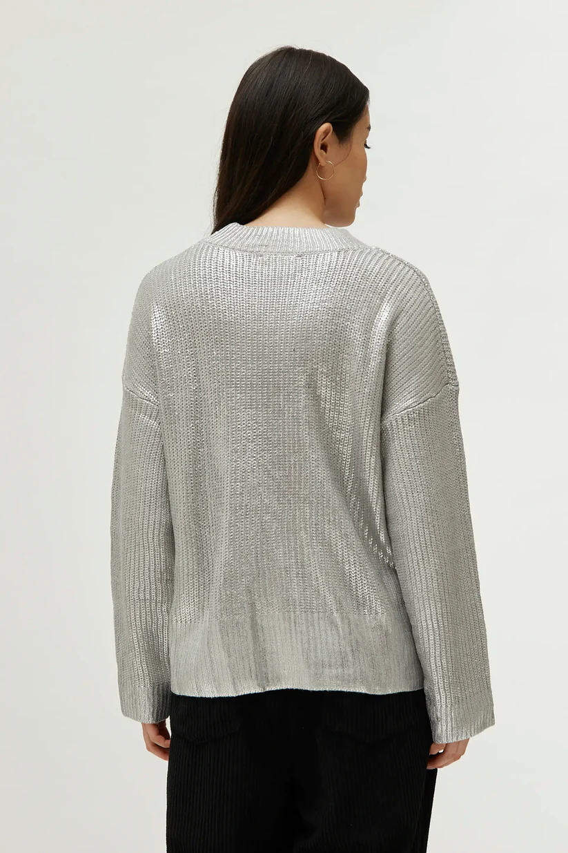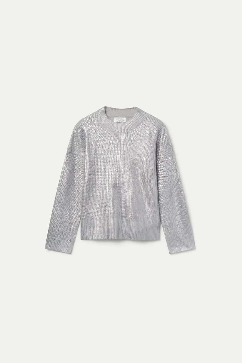 Jersey de punto revestido en un llamativo color plateado, que destaca por su elegante acabado brillante, ideal para un look audaz y sofisticado. El diseño incluye un clásico cuello redondo que aporta versatilidad, y mangas largas que ofrecen una cobertura cómoda y estilizada.
