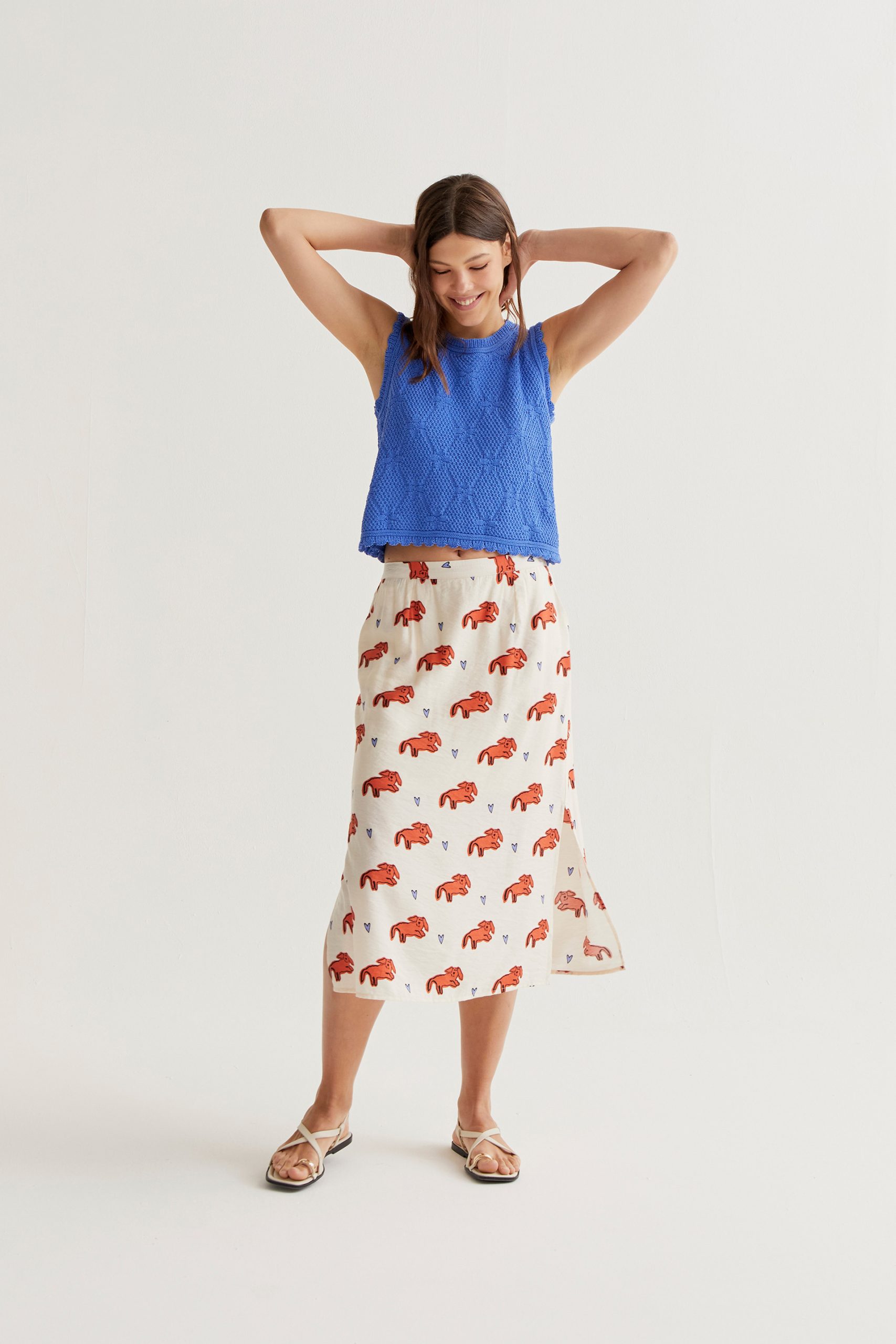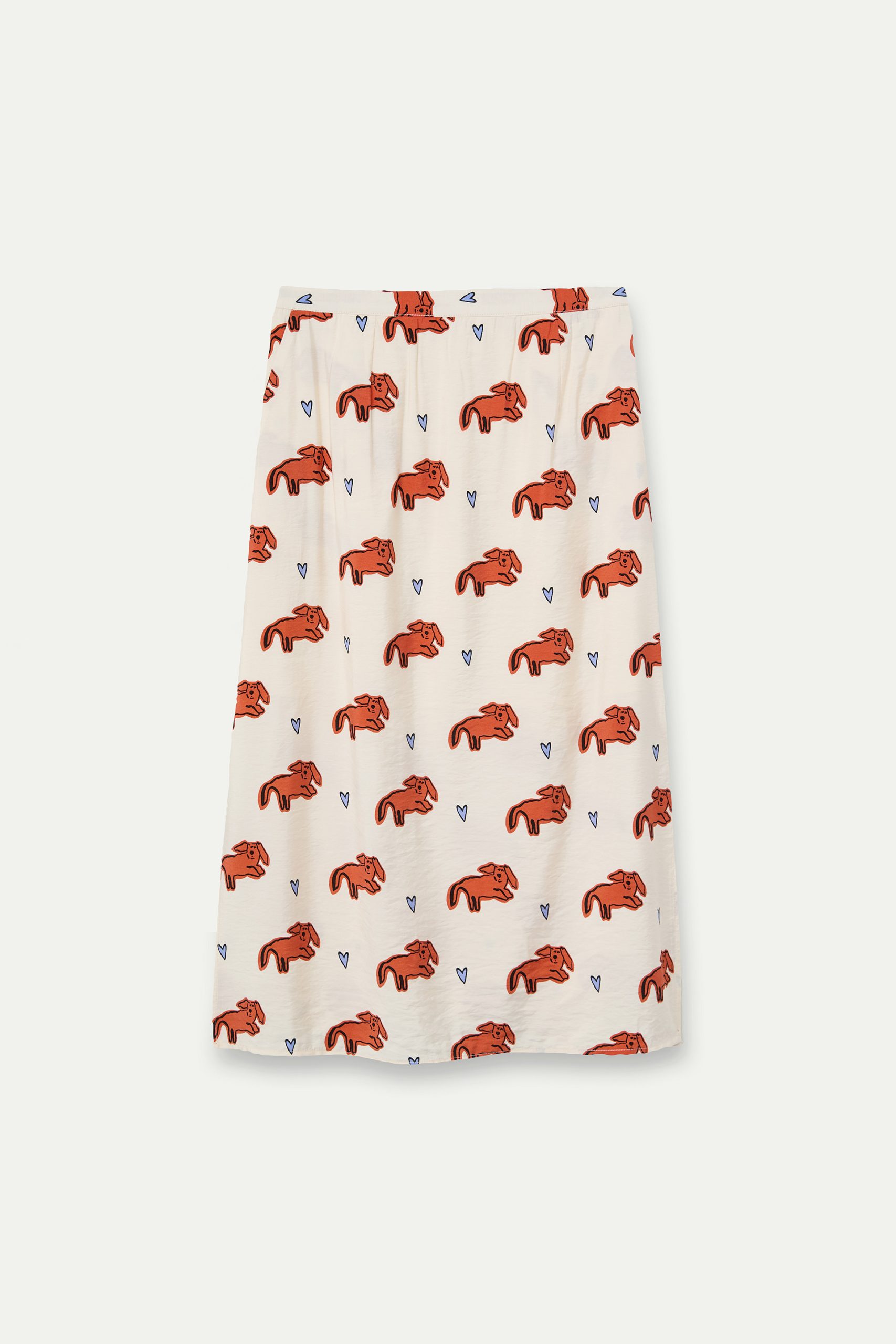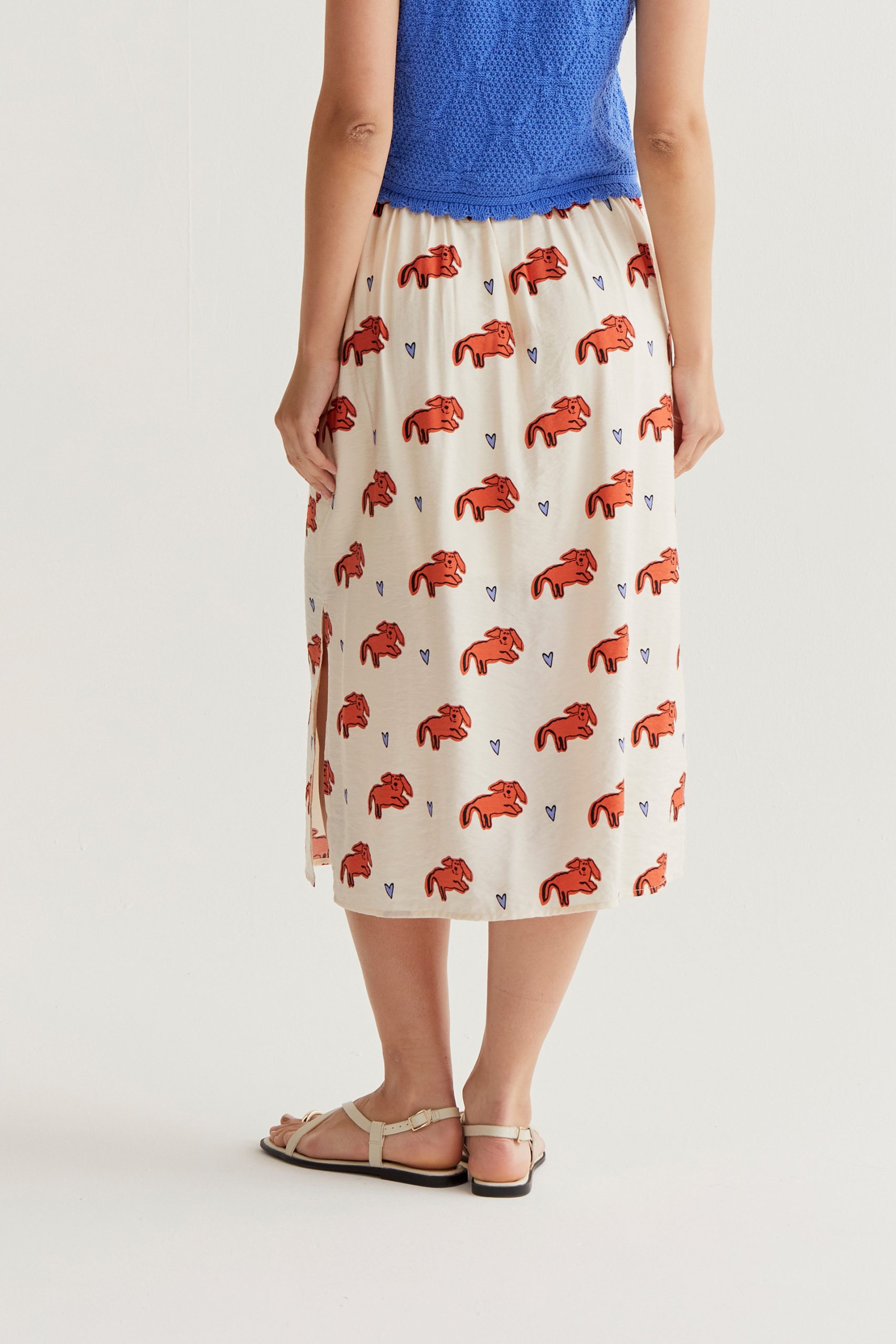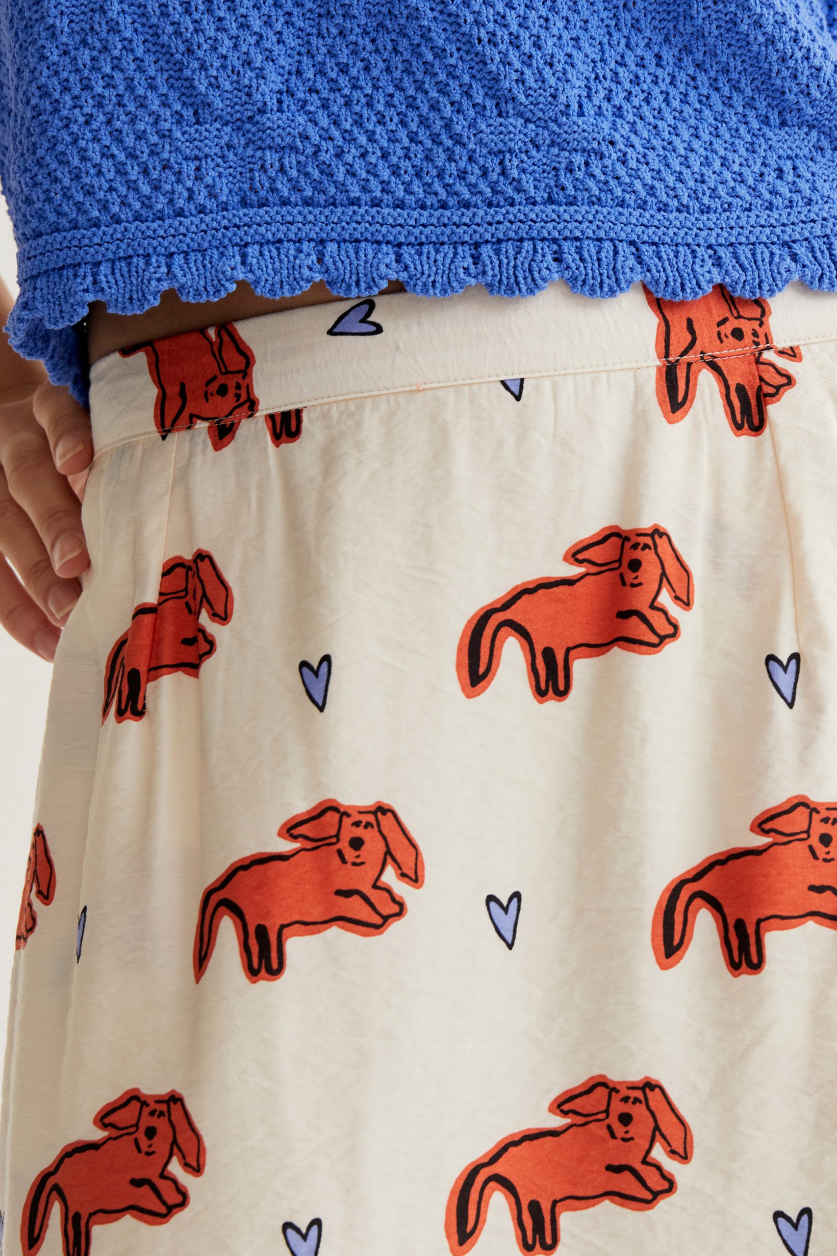 Esta falda con estampado de perros y corazones destaca por su diseño original y lleno de personalidad. El fondo claro combinado con los perritos en color naranja y pequeños corazones azules crea una prenda divertida y diferente que aporta un toque especial a cualquier conjunto.