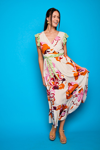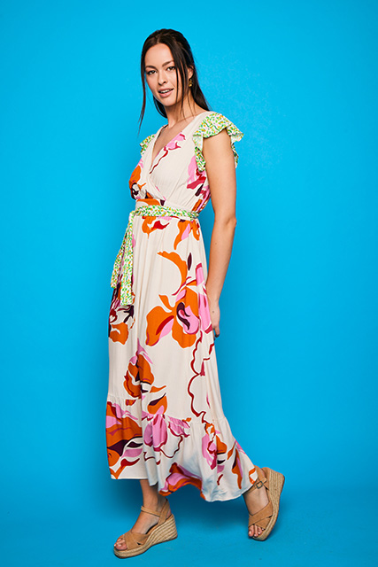 Este vestido largo cruzado es una prenda única que destaca por su diseño con volantes en el hombro y en la parte inferior, añadiendo un toque dinámico y femenino. Combina dos telas diferentes dentro de los mismos tonos, lo que le da un aire exclusivo y especial. Su corte favorecedor y los detalles cuidadosamente elaborados lo convierten en una opción perfecta para cualquier ocasión elegante.