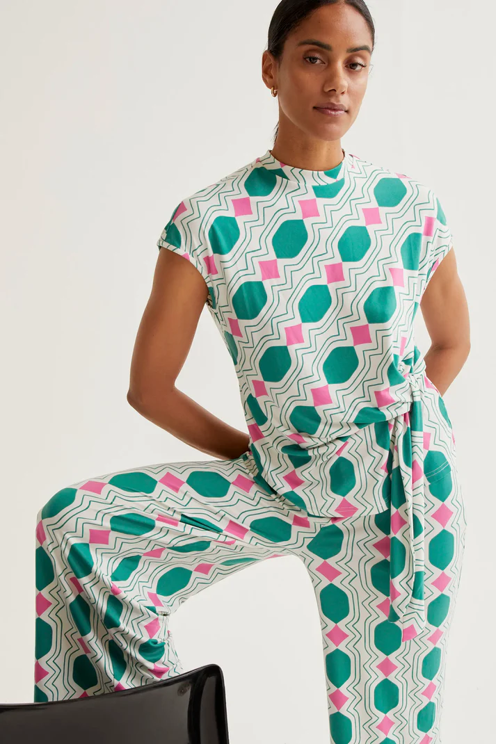 El estampado geométrico refuerza su identidad visual y lo convierte en una pieza ideal para llevar como conjunto coordinado o como protagonista del look.