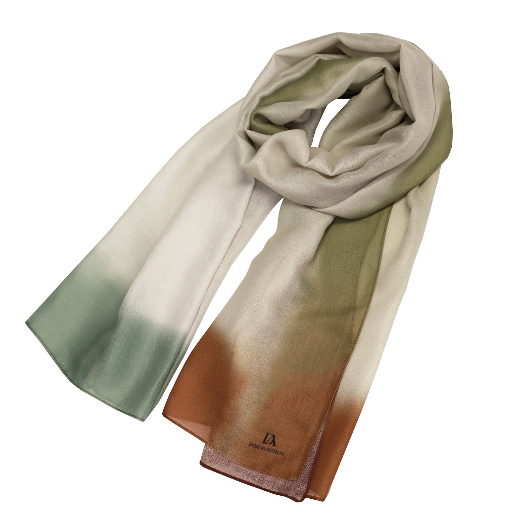 El pañuelo de mujer Don Algodón destaca por su diseño elegante y su paleta de colores inspirada en la naturaleza. Presenta un efecto degradado en tonos tierra, beige, marrón y verde oliva, que aporta calidez y sofisticación a cualquier conjunto.