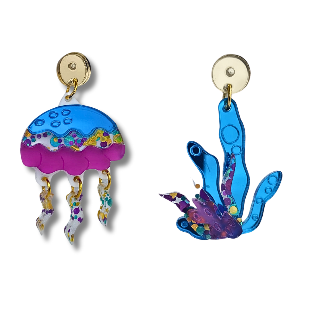 Pendiente medusa turquesa mini deluxe elaborada con metacrilatos espejos, y purpurina. Medida 4cm, cierre de laten libre de níquel.