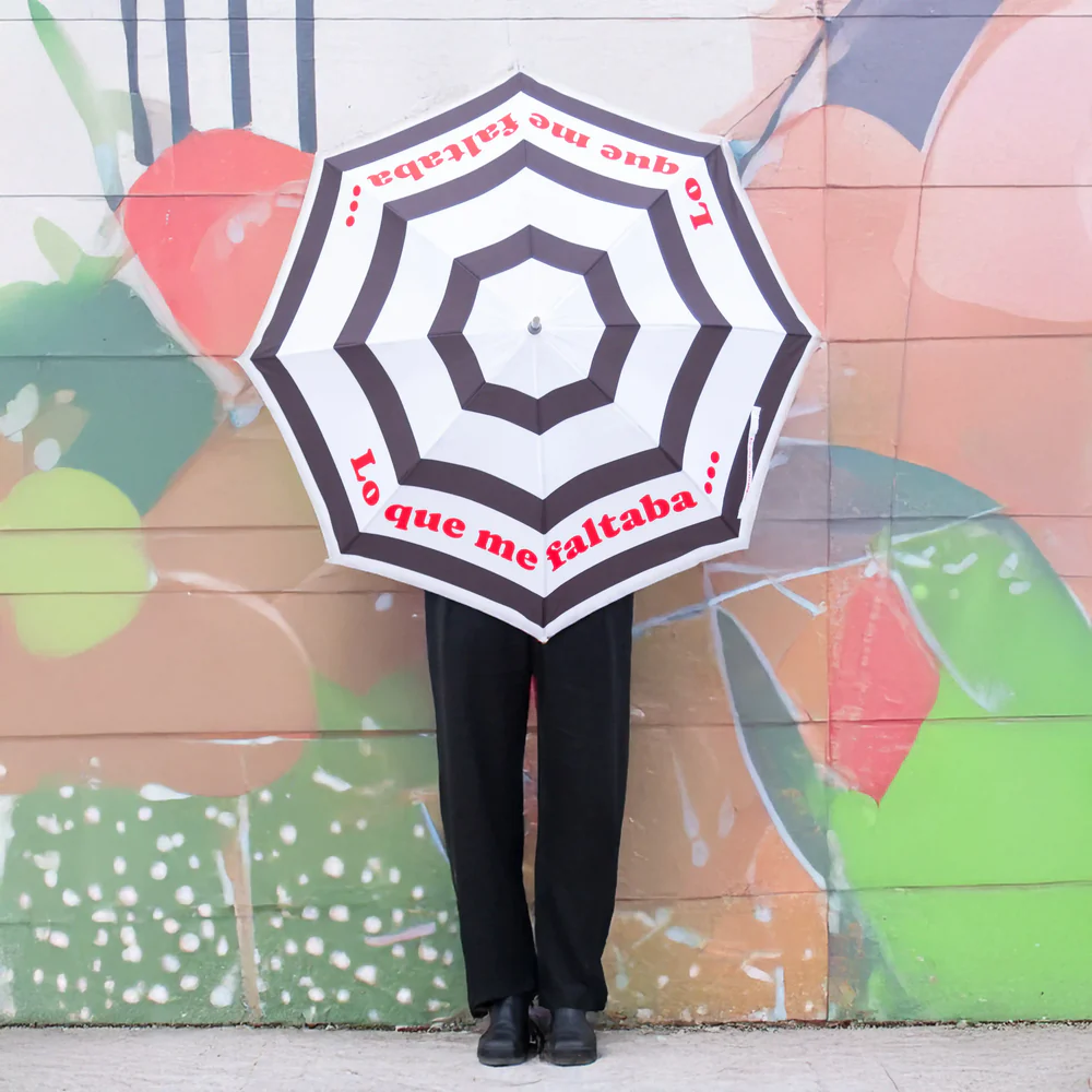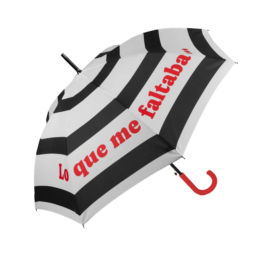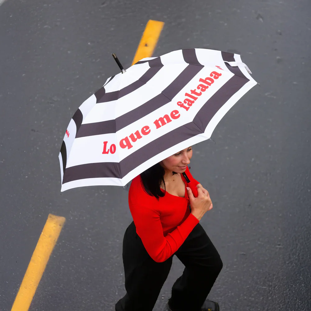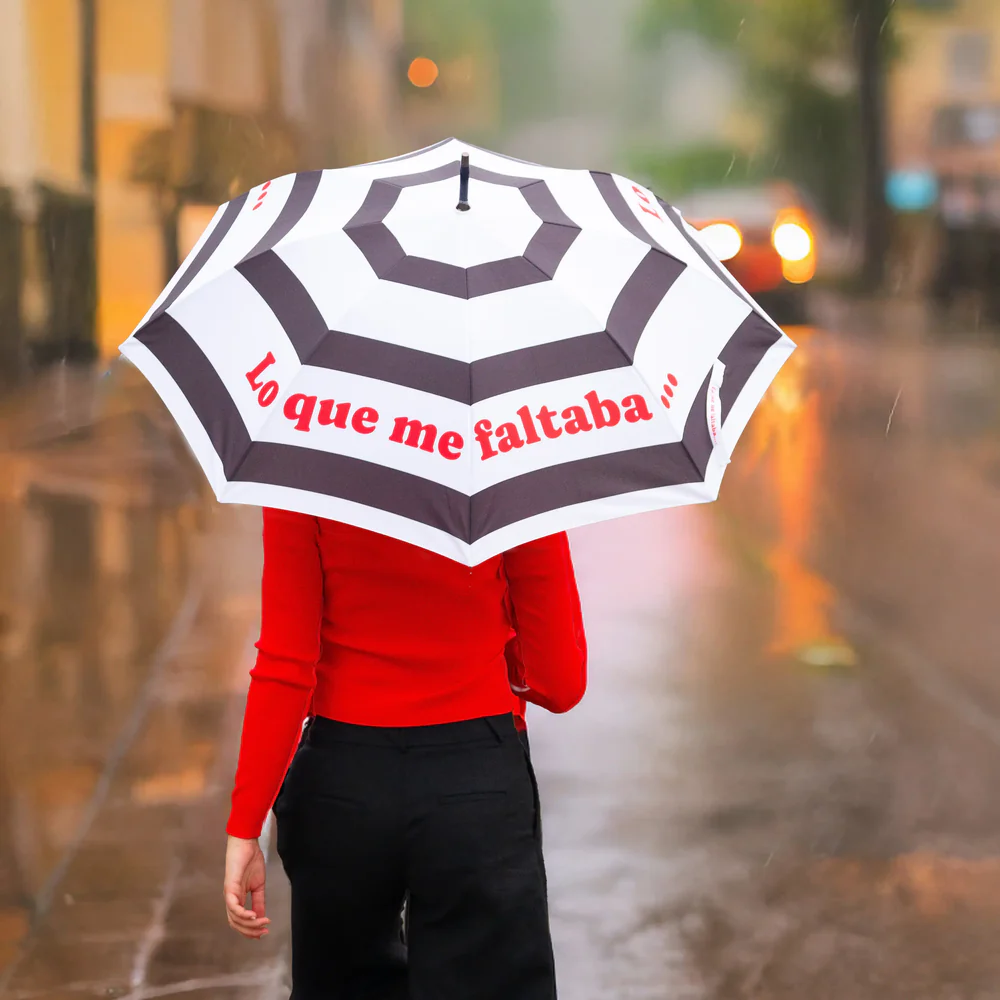 El paraguas original de rayas “Lo que me faltaba” es perfecto para tomarse la lluvia con un poco de humor, sobre todo en esos días en los que todo parece ir a contracorriente. Su diseño divertido y práctico lo convierte en un imprescindible para llevar siempre en el bolso, la mochila o el coche.