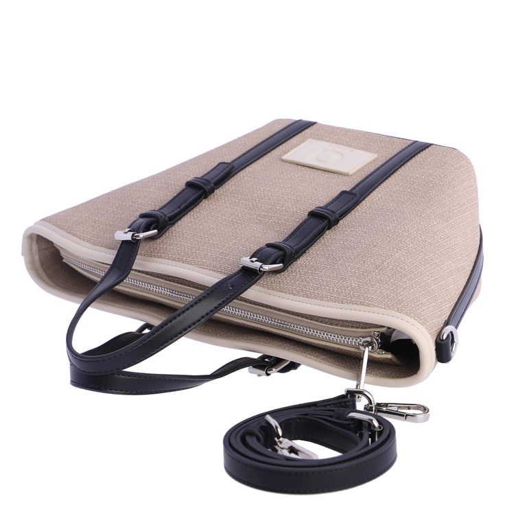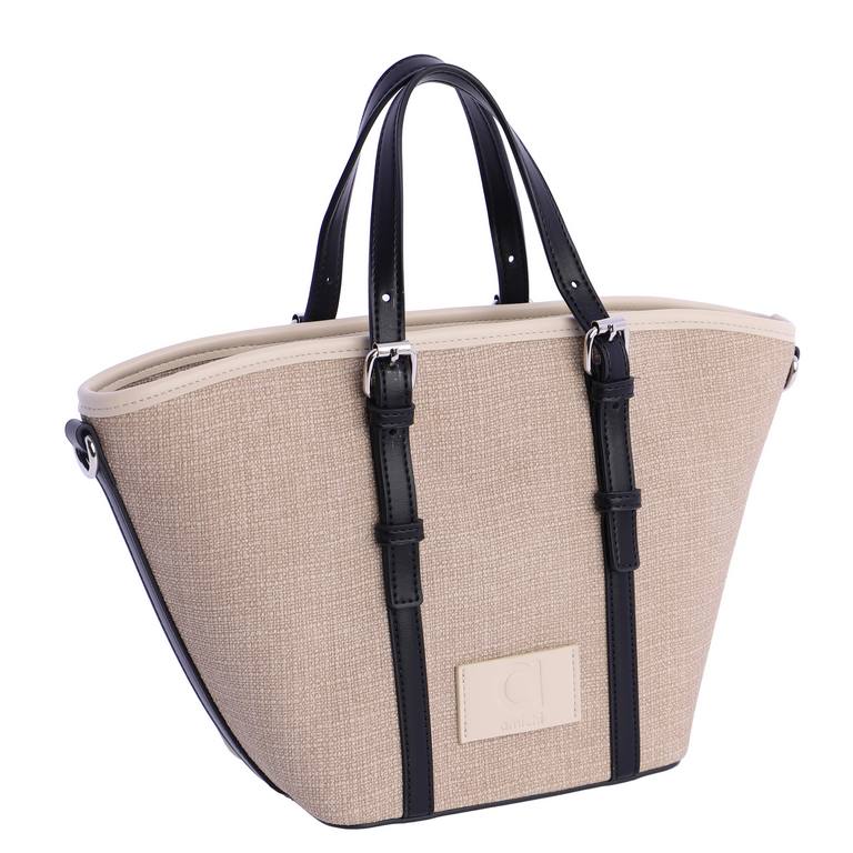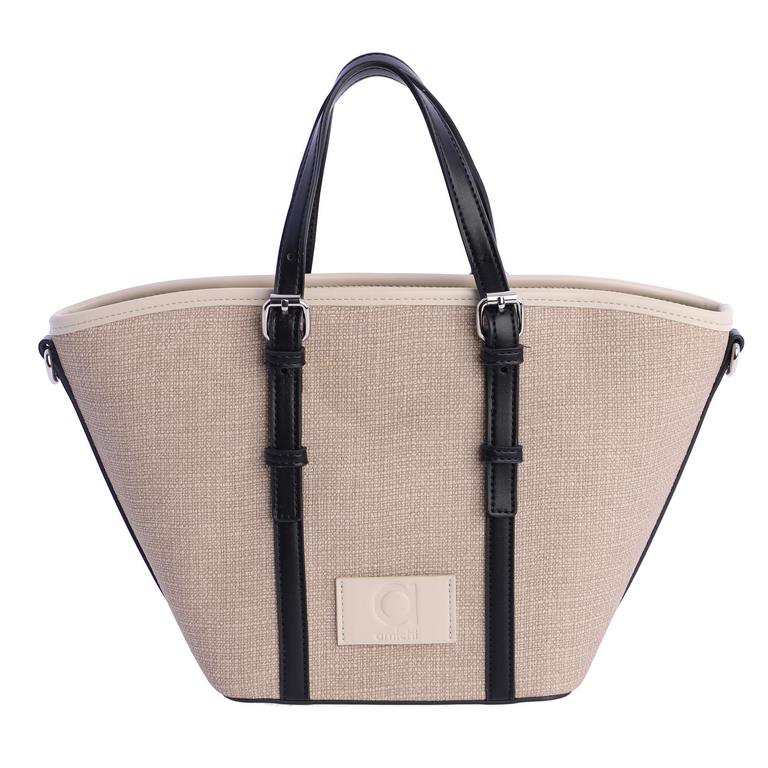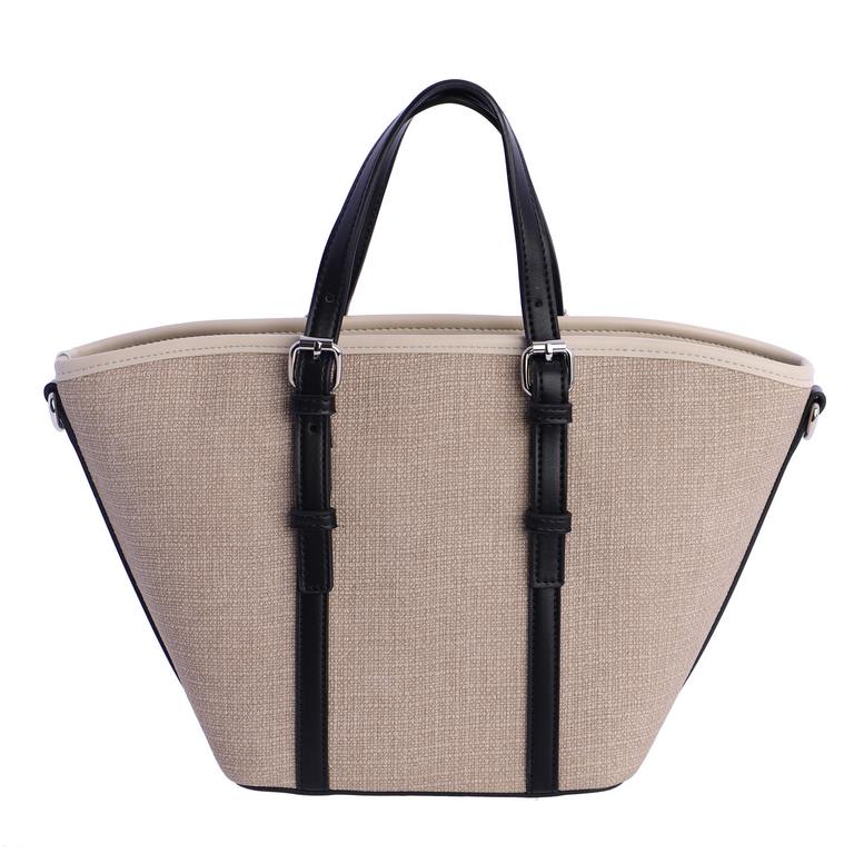 Este bolso shopper para mujer con acabado textil efecto rafia es una opción ideal para quienes buscan un complemento elegante con inspiración natural. Su diseño combina un tejido con textura tipo rafia en tono neutro con detalles en contraste, creando un equilibrio perfecto entre estilo moderno y estética veraniega.