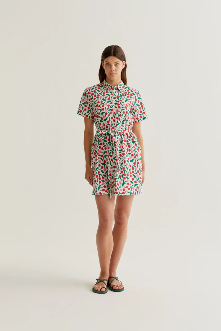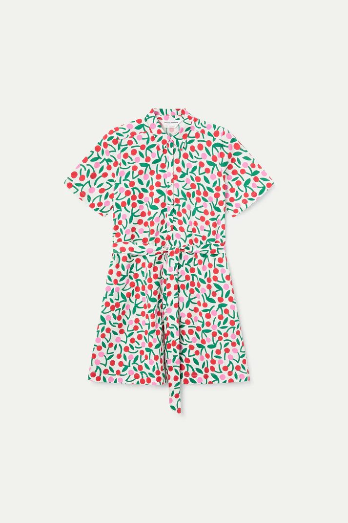 El vestido corto con estampado guinda es una prenda fresca y con personalidad, ideal para aportar color y carácter a cualquier look. Su cuello solapa estructura el diseño, mientras que la manga corta mantiene una línea limpia y favorecedora.