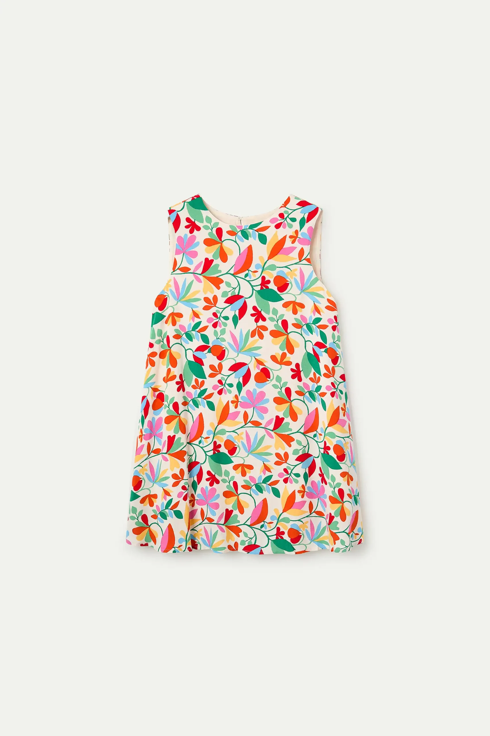 Su corte amplio y ligero proporciona comodidad y una caída natural, mientras que el diseño sin mangas lo convierte en una opción ideal para el verano. Incorpora un cierre trasero con abertura y botón, aportando un detalle sutil y práctico.