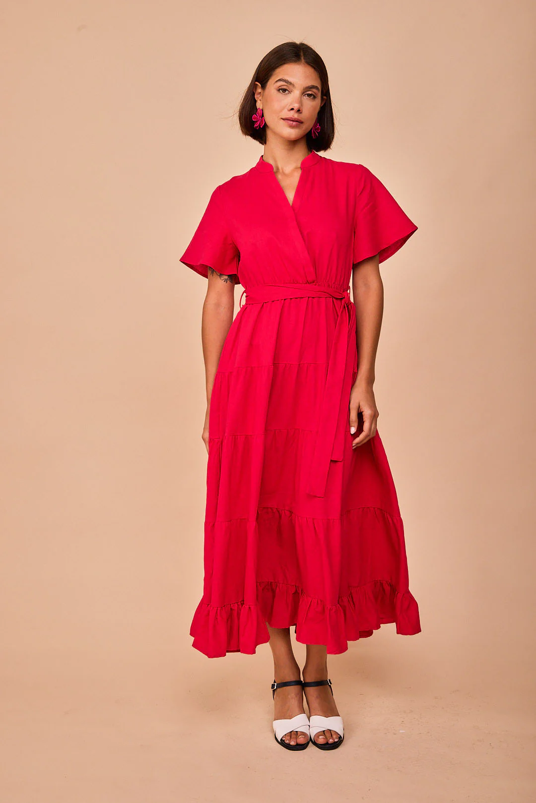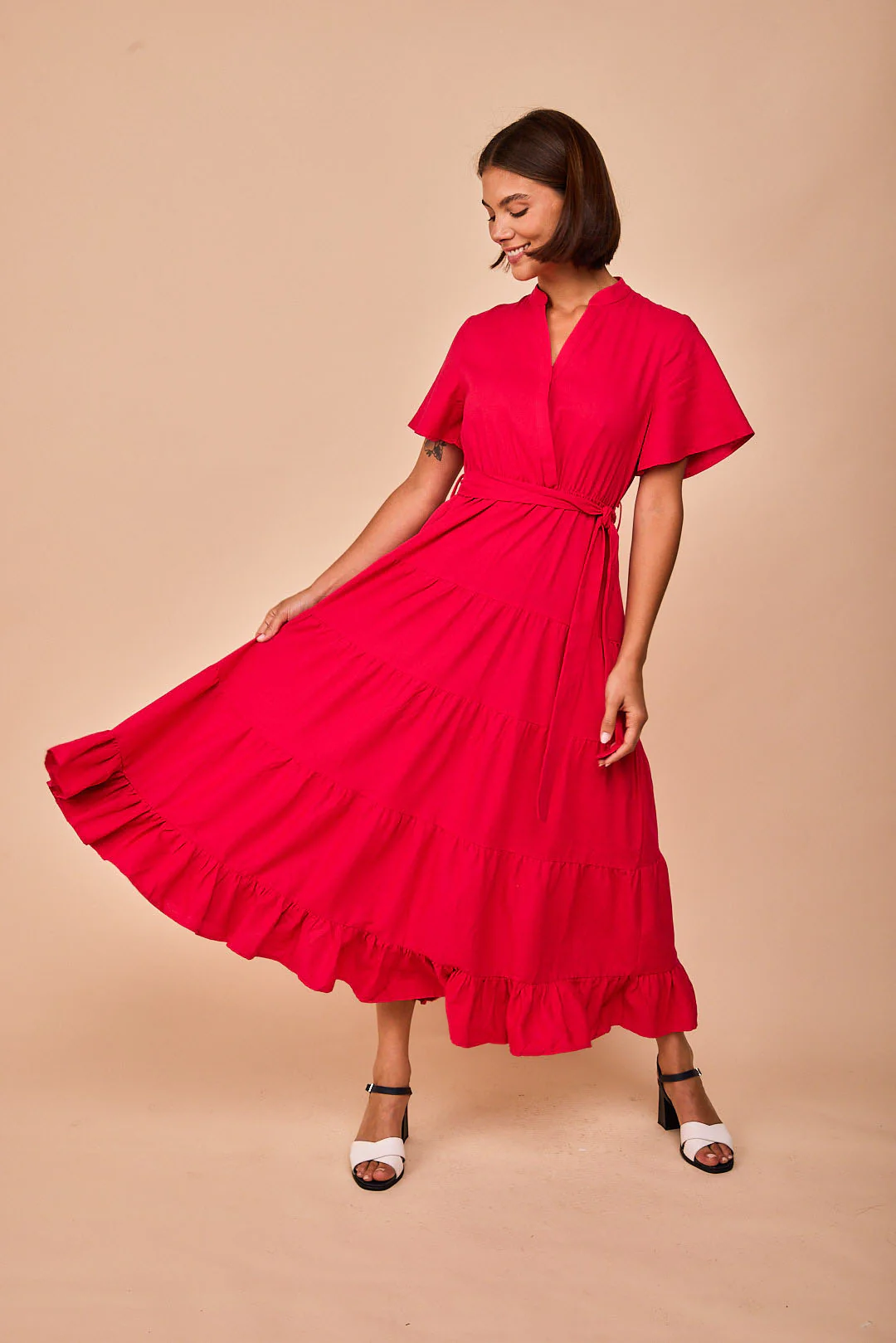 La prenda incorpora volantes que aportan movimiento y un toque especial al diseño. Además, incluye un cinturón confeccionado con la misma tela, que permite ajustar la silueta y adaptar el vestido a diferentes estilos.