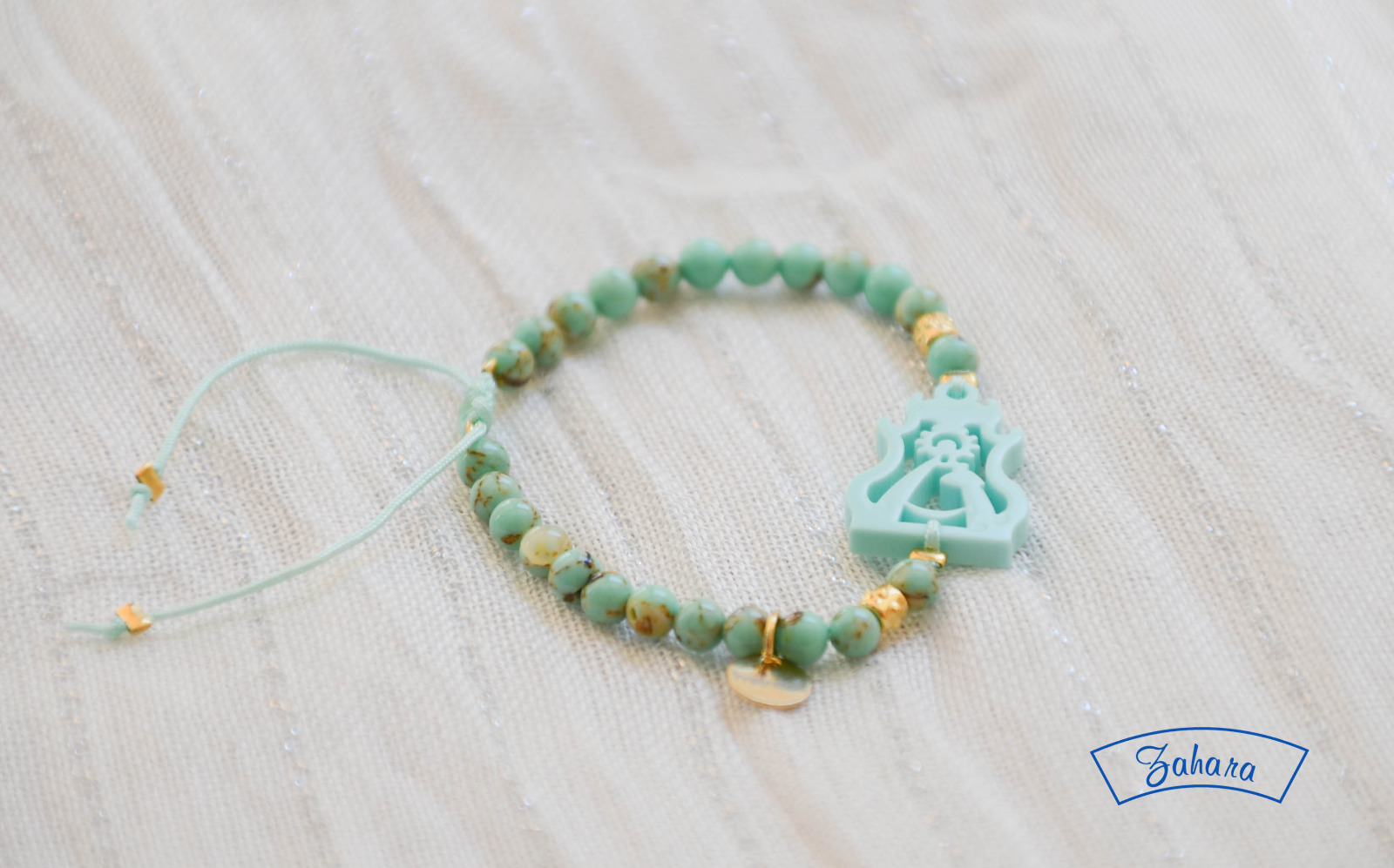 Todas las fornituras metálicas son de acero y llevan baño de oro. Se trata de un producto de bisutería y por eso se recomienda no mojarlo, ya que tanto el hilo como las fornituras de acero pueden perder antes su color.